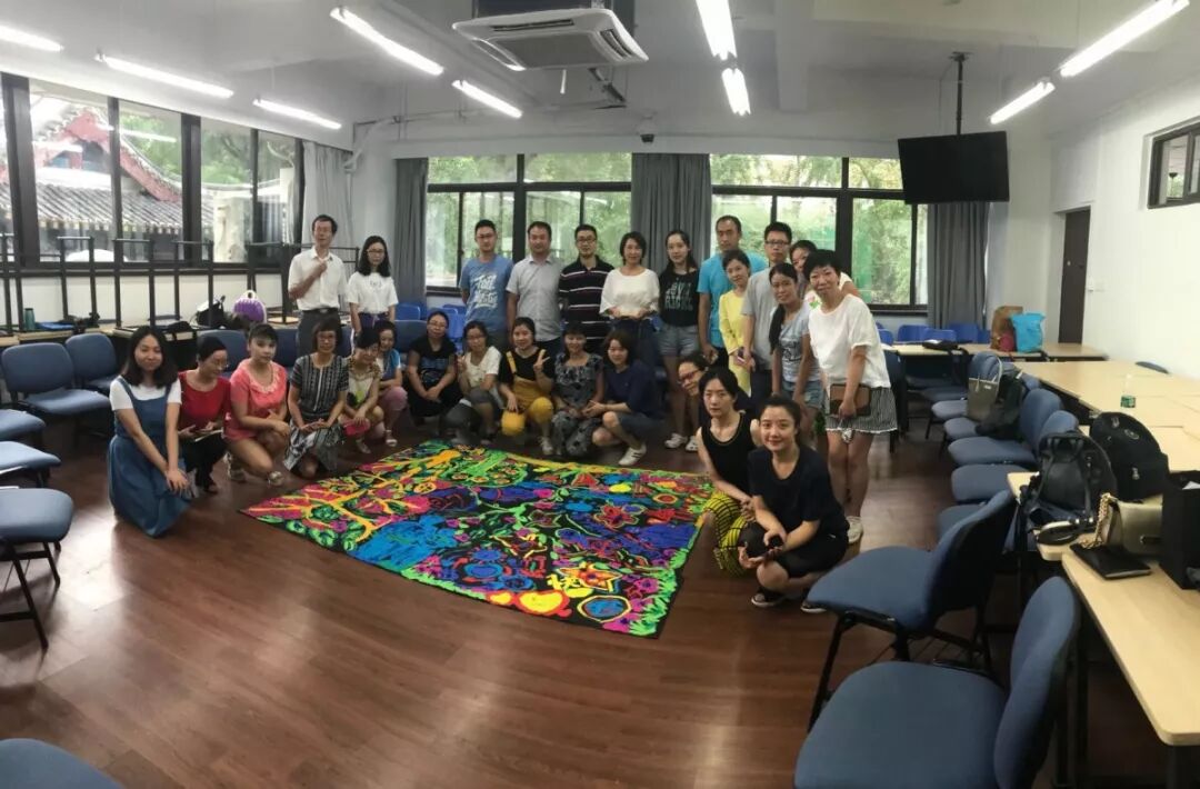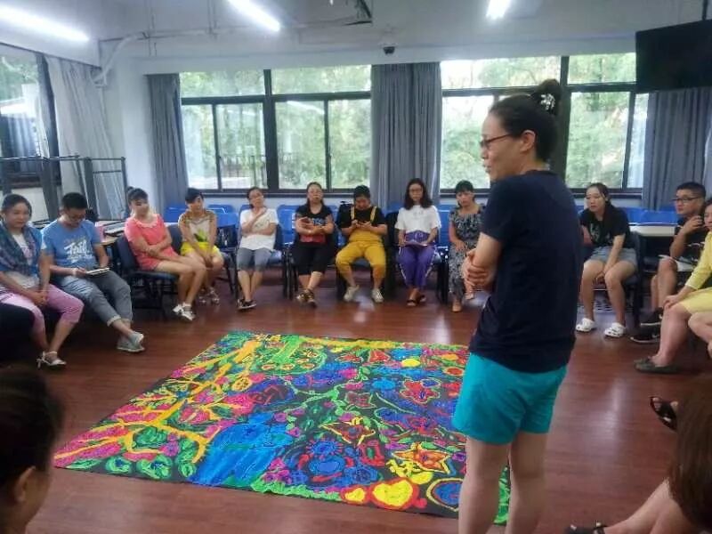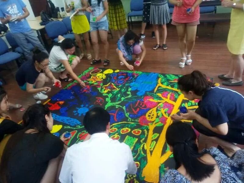 艺术让每个人在不自觉的过程中展示自我。曾凡敏教授用美术的形式让每位学员觉察自我,探索自我。在同一幅作品中,每个人都将自己的内在用不同颜色,线条,形状记录在画布上,督导结束时,每位学员再次看到共同完成的作品,对自我有了更深的了解。